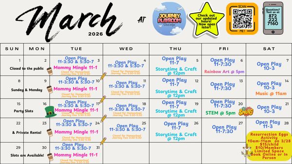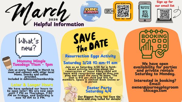 Welcome to The Journey Playroom! Our mission is to create an environment that nurtures every child's journey through play as they grow. We have carefully designed this playroom to cover all forms of play essential for early childhood development, including kinesthetic, fine motor, and imaginative play, combining expert knowledge with heartfelt care. Our education based playroom is designed to inspire a love for learning, foster creativity, and create lasting memories. Join us at The Journey Playroom, where every child's unique journey through play is celebrated. We offer open play, educational classes, and private rentals for birthday parties, Mom's groups, baby showers, therapeutic play, and much more!